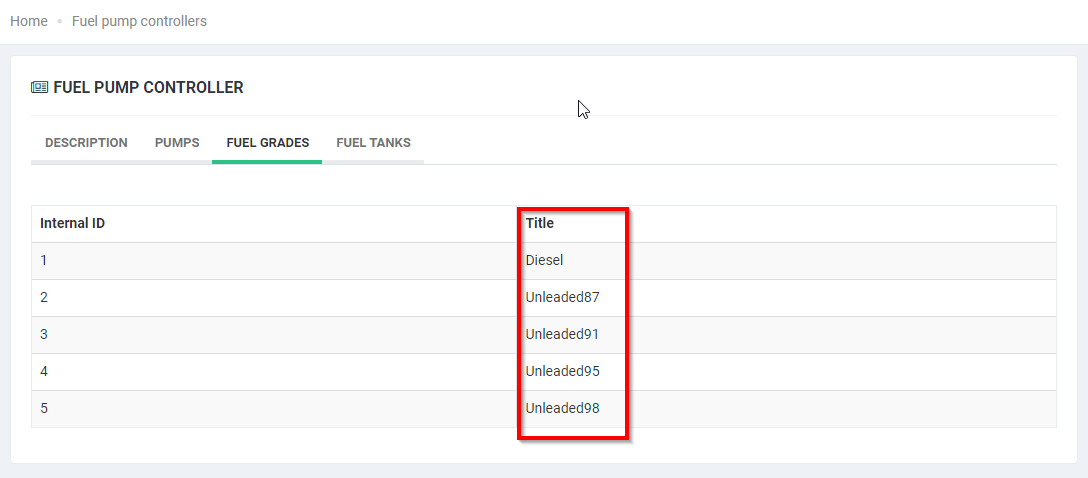 The inCust platform receives fuel grades from transmitted controller configurations. The platform does not change this data. They are used to link fuel products created in the Business Control Panel, which will be displayed in various applications where fuel is purchased and sold. You should make sure that the Code / Article item described in the Goods Settings is identical to the Title specified in the controller settings.